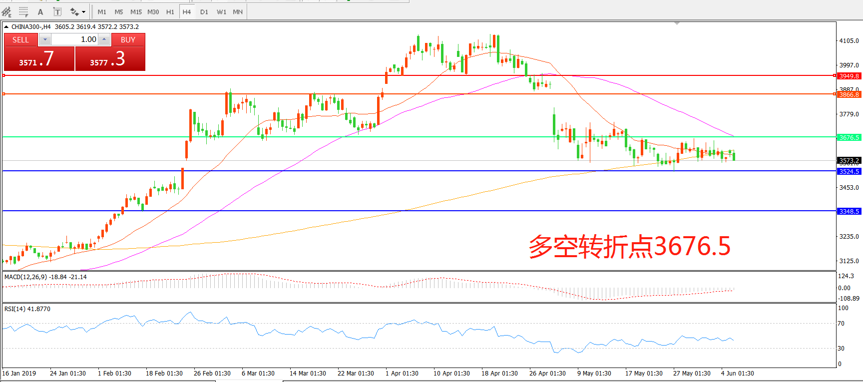 4小时图看,沪深300指数在跌破3676.5后陷入窄幅震荡, 200均线成为短期争夺焦点,MACD绿柱缩短,RSI指标拐头向下,日内以震荡下行思路对待。