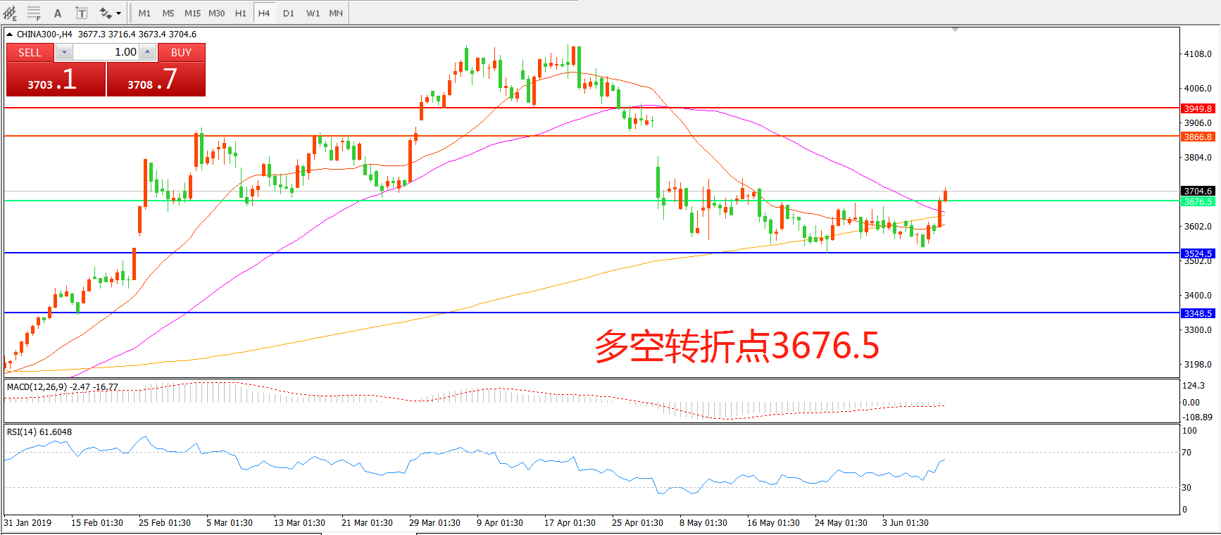 4小时图看,沪深300指数日连续盘整后阳线暴力拉升,整体走势有所回暖, 短期均线有拐头迹象,MACD绿柱缩短,RSI指标拐头向上,日内延续上行概率较大。