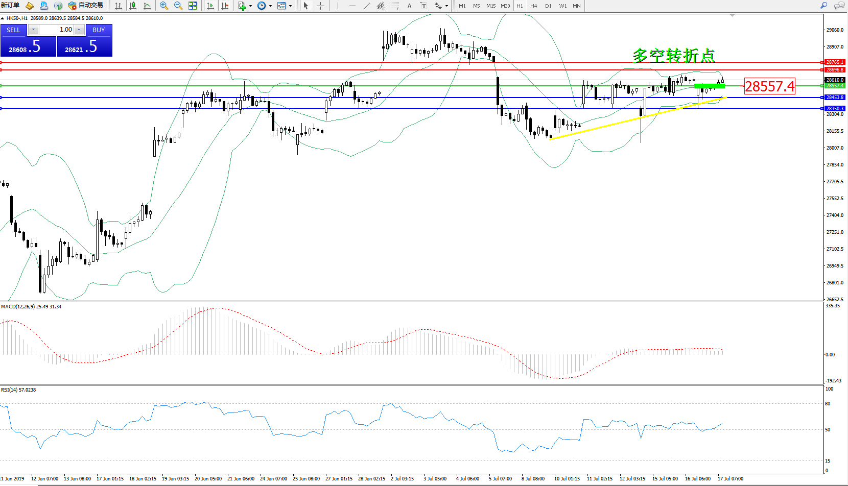 香港恒生指数7月17日(周三)收盘下跌26.45点,跌幅0.09%,报28593.17点;恒指早上低开155点后,再扩大跌幅,恒指低见28377,最多跌242点。终止连升5日的升势,港股继续吹无定向风,并继续于28000-29000点上落。其实自6月中旬以后,恒指一直在此区间上落,亦由于市场观望气氛仍浓,成交萎缩之余港股亦变得欠缺方向。至于何时能出现突破似乎短期内亦难有憧憬,因此投资者亦暂只宜维持‘不变应万变’策略。