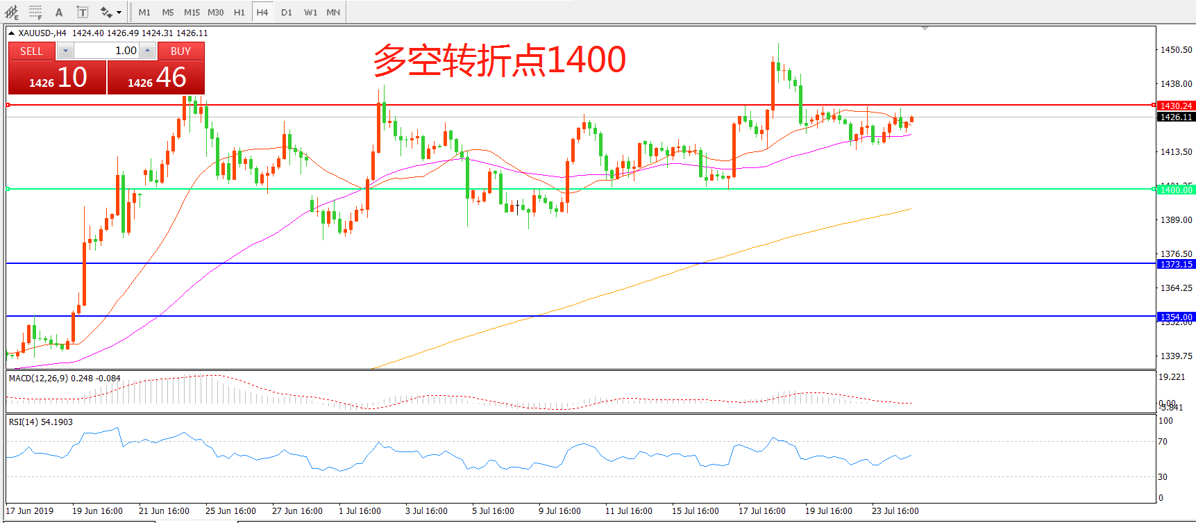 周三(7月24日)金价维持区间震荡的走势,价格整体运行在1420美元上方。日内欧美公布的制造业PMI数据不及预期,同时全球央行宽松预期继续支撑金价,英国硬脱欧的担忧和中东局势也是金价支撑因素。美联储议息会议在即,市场整体表现偏向谨慎。