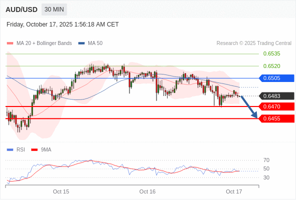 在 0.6505 之下,看跌,目标价位为 0.6470 ,然后为 0.6455 。