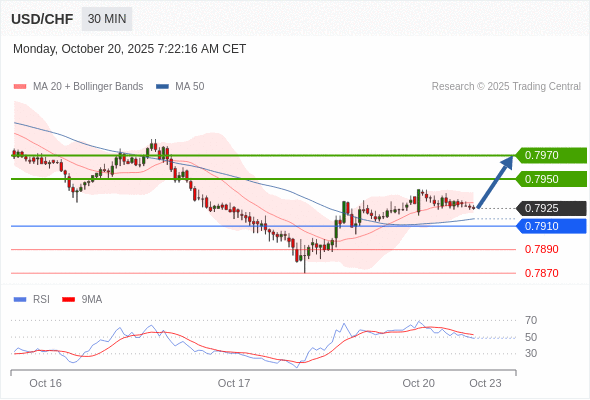 美元/瑞郎 当日内: 在0.7910之上,看涨。