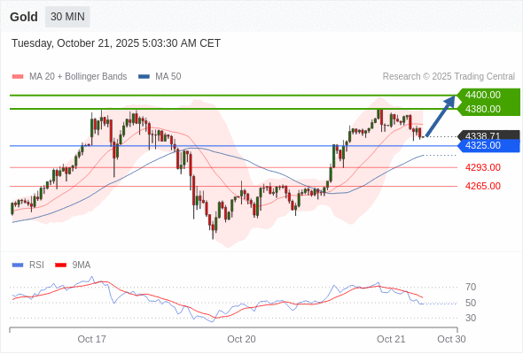 在 4325.00 之上,看涨,目标价位为 4380.00 ,然后为 4400.00 。