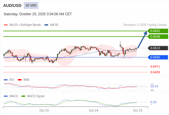 澳元/美元 当日内 : 看涨,当 0.6492 为支撑位。