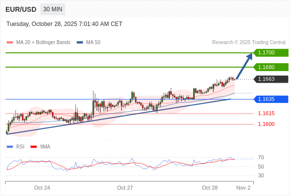在 1.1635 之上,看涨,目标价位为 1.1680 ,然后为 1.1700 。