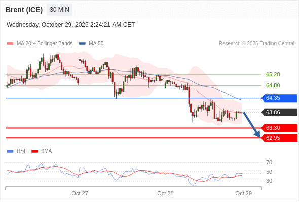 在 64.35 之下,看跌,目标价位为 63.30 ,然后为 62.95 。