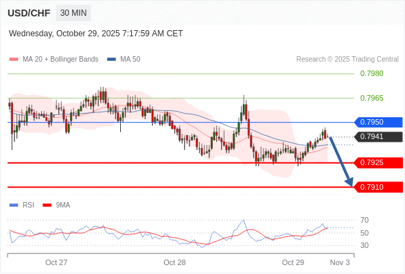 在 0.7950 之下,看跌,目标价位为 0.7925 ,然后为 0.7910 。