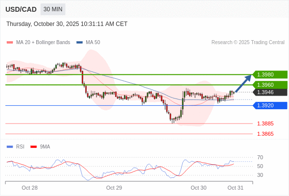 在 1.3920 之上,看涨,目标价位为 1.3960 ,然后为 1.3980 。