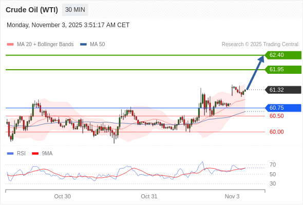 在 60.75 之上,看涨,目标价位为 61.95 ,然后为 62.40 。