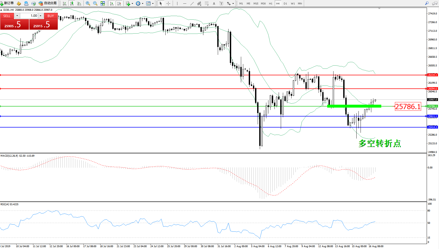 道琼斯指数816日(周五)收盘上涨306.60点,涨幅1.20%,报25886.01点。美国股市周五连续第二天上涨,主要股指结束了动荡的一周。投资者继续关注财报、贸易关系的进展与经济增长放缓风险等因素。没有新的激化贸易局势的言论让投资者情绪有所纾缓,另外投资者还猜测,如果欧洲的经济增长继续下滑,该地区的官员将会加大政策刺激。美国国债走低,收益率从多年低点回升。市场开启风险偏好模式;,投资者注意力转向下周在杰克逊霍尔举行的全球央行行长会议。随着围绕贸易问题的忧虑情绪缓和,投资者重返股市。
