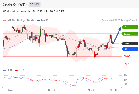 在 60.40 之上,看涨,目标价位为 61.10 ,然后为 61.40 。