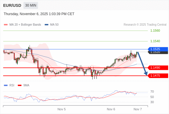 在 1.1525 之下,看跌,目标价位为 1.1490 ,然后为 1.1475 。