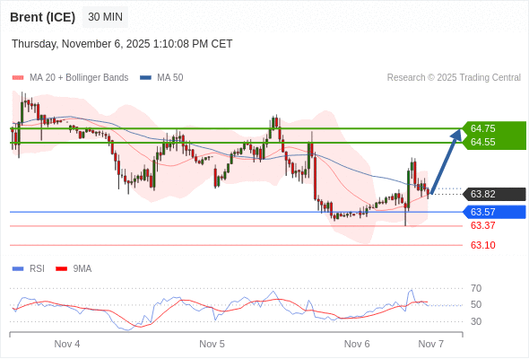 在 63.57 之上,看涨,目标价位为 64.55 ,然后为 64.75 。