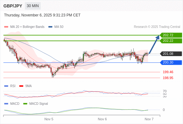 备选策略: 如跌破 200.30 ,GBP/JPY 目标方向定在 199.46 和 198.95 。