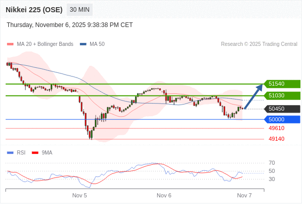 日经225股指期货 (OSE) 当日内: 朝51030运行。