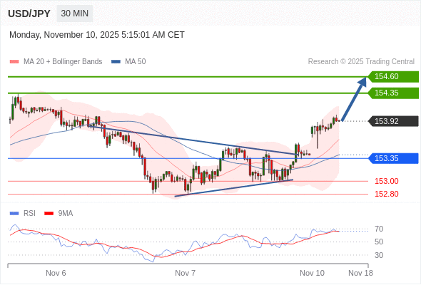 在 153.35 之上,看涨,目标价位为 154.35 ,然后为 154.60 。