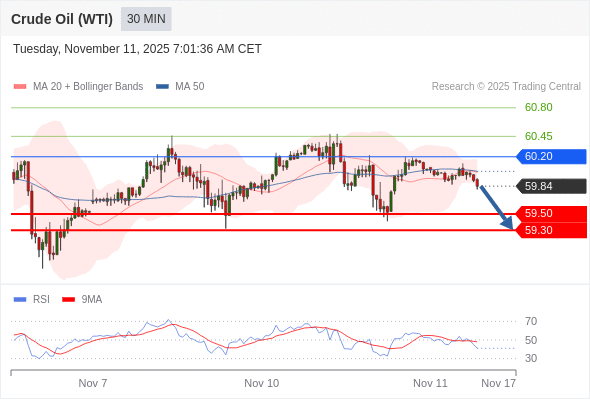 在 60.20 之下,看跌,目标价位为 59.50 ,然后为 59.30 。