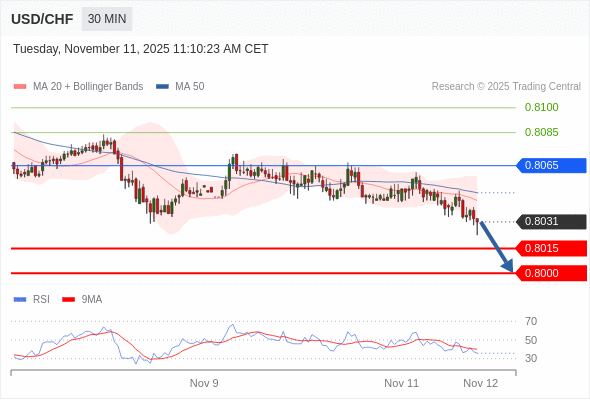 在 0.8065 之下,看跌,目标价位为 0.8015 ,然后为 0.8000 。
