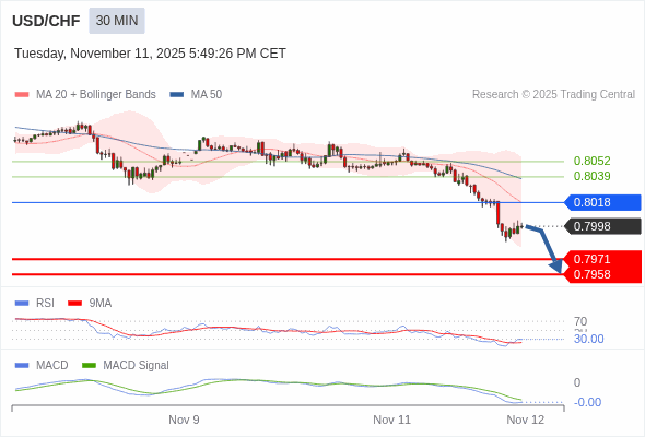 美元/瑞郎 当日内 : 看跌,在 0.8018 之下。