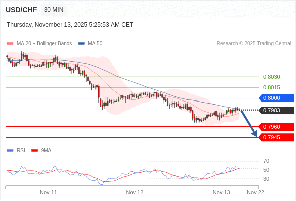 在 0.8000 之下,看跌,目标价位为 0.7960 ,然后为 0.7945 。