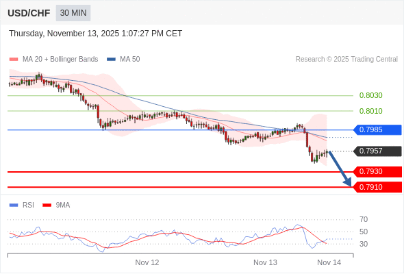 在 0.7985 之下,看跌,目标价位为 0.7930 ,然后为 0.7910 。