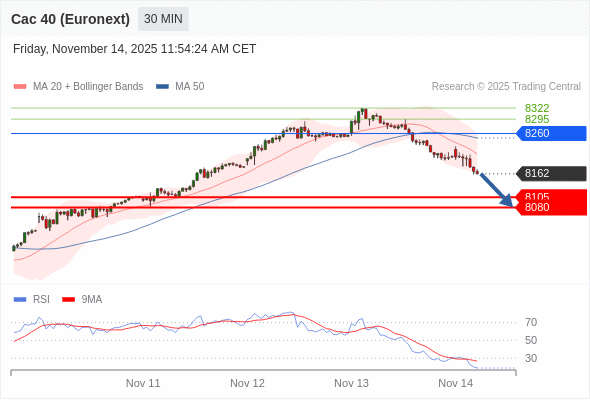 法国CAC指数期货 (Euronext) (X5) 当日内: 存在压力。