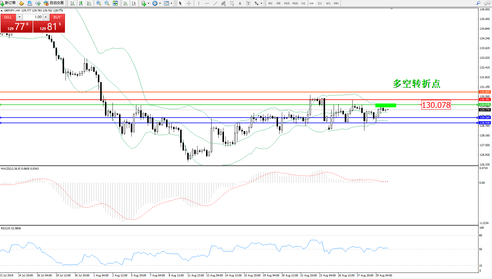 交易策略:130.078下方看跌,目标129.269、128.938