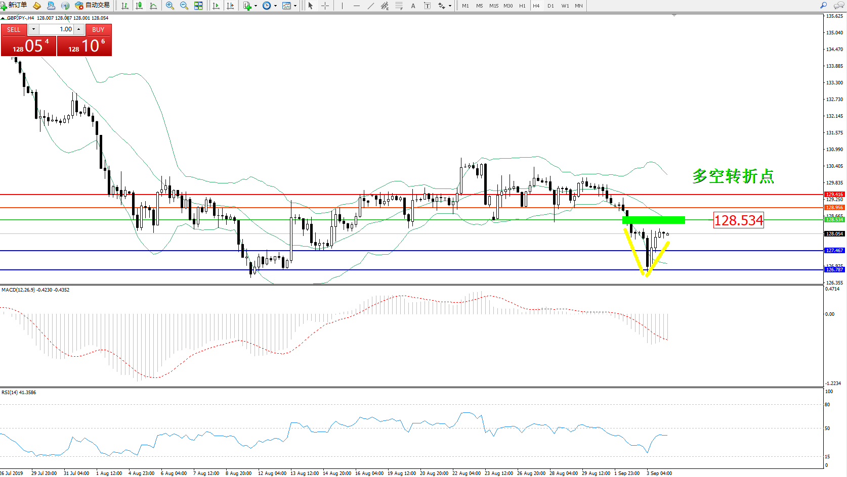 交易策略:128.534下方看跌,目标127.467、126.787