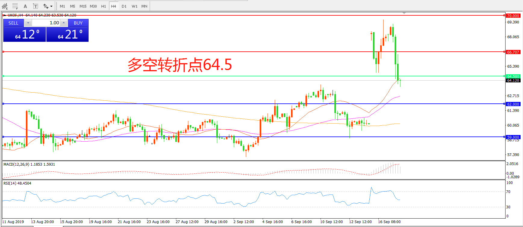 周二(9月17日)有消息指出,沙特接近恢复570万桶/日产量损失的70%,而沙特石油产量将在未来2-3周完全恢复,沙特原油产量恢复速度快于预期令多头信心严重受挫,美、布两油跌幅一度扩大至逾6%,美国鉴定出导弹在伊朗发射的位置,美国副总统彭斯即将前往沙特,原油自低位震荡反弹,最终布伦特原油收跌6.5%,报64.12美元/桶。