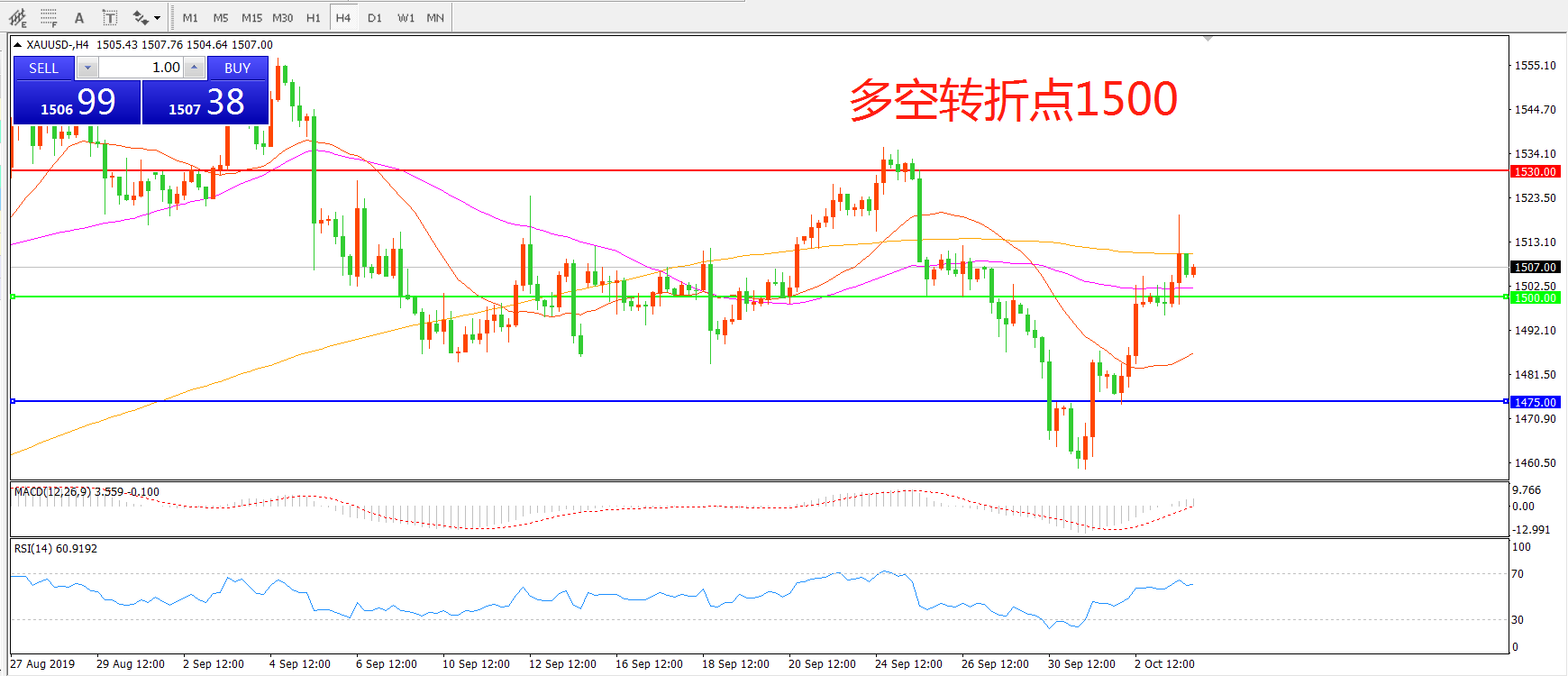 周四(10月3日),美国近期公布的ISM非制造业指数表现不及预期,令市场愈发担忧经济将陷入衰退。眼下市场已经充分消化了10月底会议上的降息预期。美盘时段盘中,现货金价一度大幅攀升,最终收报1508.15美元/盎司。但在今晚美国非农就业报告公布之前,市场投资者依然会保持谨慎,务必重点关注数据表现。