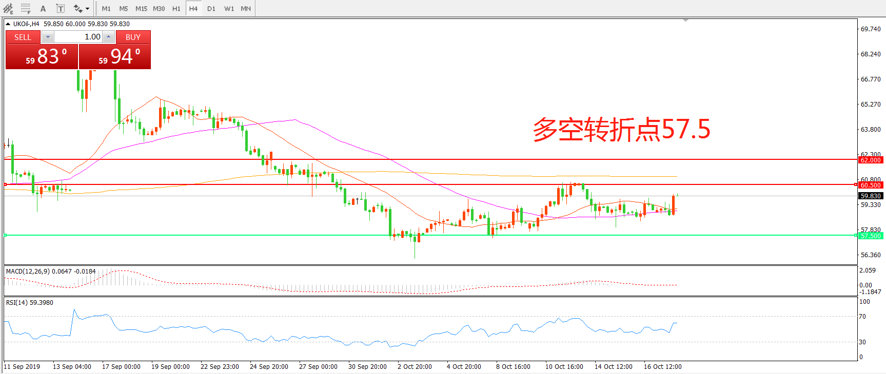 4小时图看,油价长阳反弹,突破短期整理区间,短期有可能上行测试上方60.50美元一线阻力,整体走势有所回暖,21周期均线与55周期均线粘合,RSI指标走平,日内延续震荡概率较大。