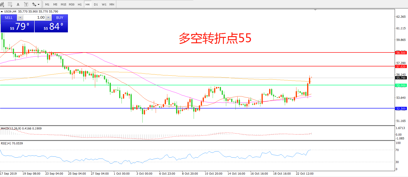 4小时图看,油价阳线连续反弹,突破前期阻力,整体走势偏强,200周期均线被突破,55美元成为下方支撑,MACD红柱增加,日内延续上行概率较大。