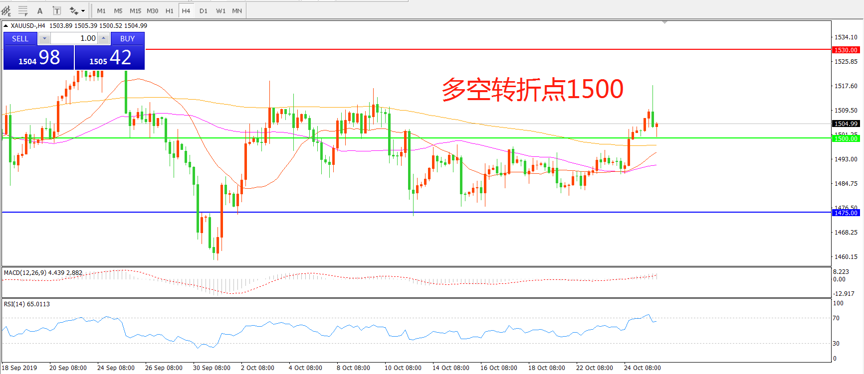 上周金价整体呈现震荡上行的走势,英国脱欧局势一波三和,欧美数据表现疲软,市场风险情绪的高涨提升了黄金的避险需求,周五,金价一度大涨,逼近1517.86美元/盎司,创近四周新高。但随着美联储鹰派降息预期升温,国际贸易局势传来利好消息,金价冲高回落,最终收报1504.98美元/盎司。