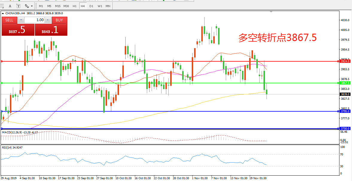 4小时图看,沪深300触碰3924阻力再次下行,短期格走势偏空,均线系统形成死叉,MACD绿柱增加,RSI指标向下,日内延续下行的概率较大。
