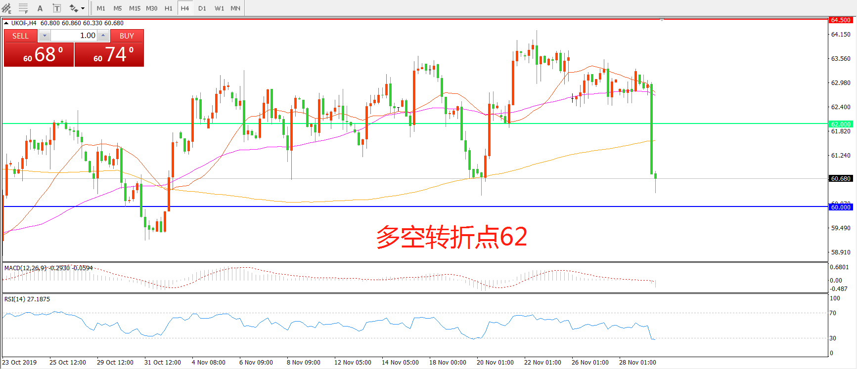交易策略:在62.00之下看跌,目标60.00    57.50