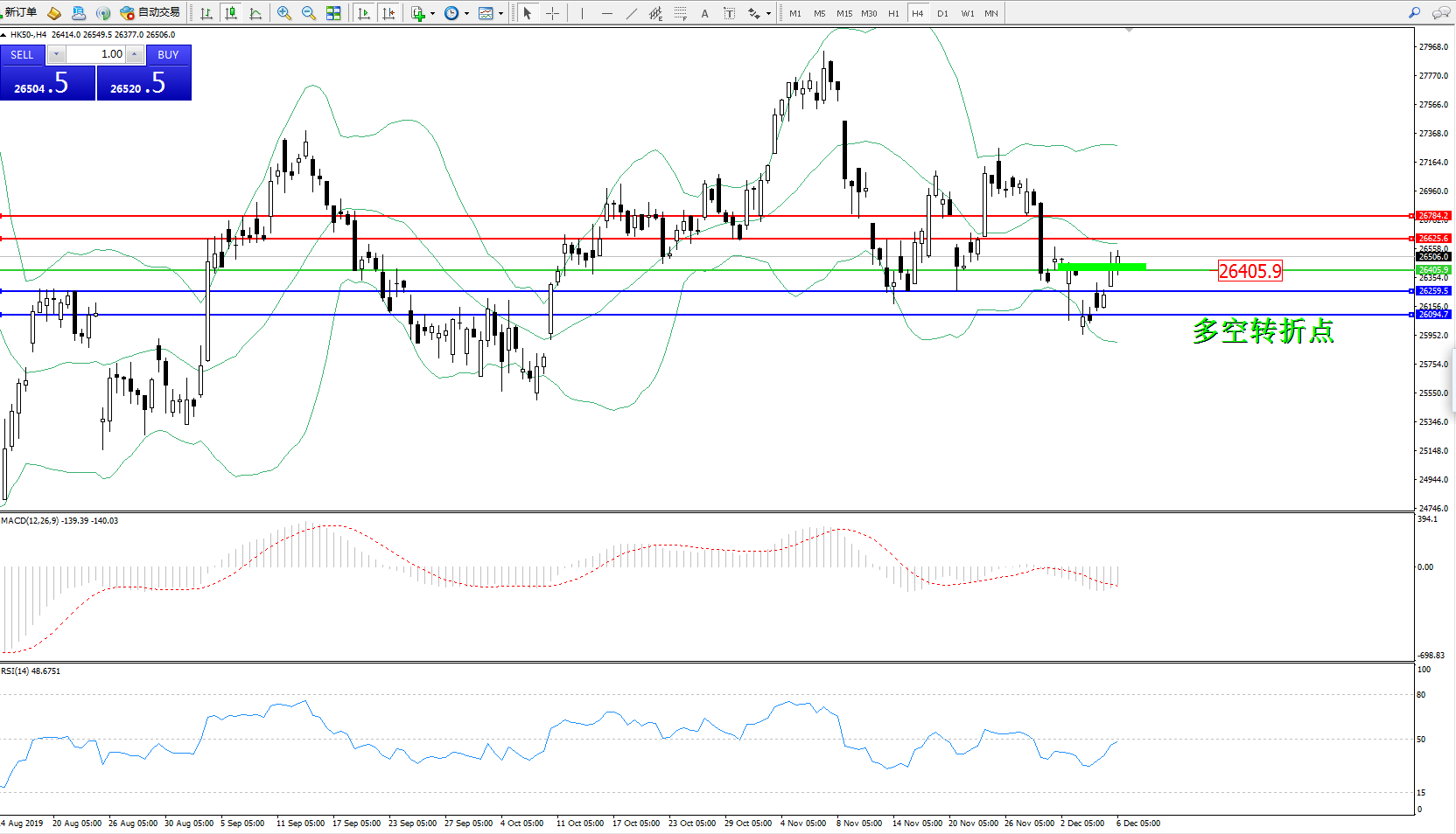 香港恒生指数12月6日(周五)收盘上涨281.33点,涨幅1.07%,报26498.37点;港股早上高开后曾收窄升幅,至仅升92点,恒指报26309,随后有买盘支持再造好,最多升258点,高见26475。恒指向上的动力仍不足,说明当前还未摆脱偏弱势的局面。倘若消息面上无明显变化,恒指大概率是会在当前点位附近进行盘整的。中美双方达成首阶段协议预期仍旧较大,市场持续观望国际贸易发展走向,如果消息利好,那么新一轮的行情也将开启。