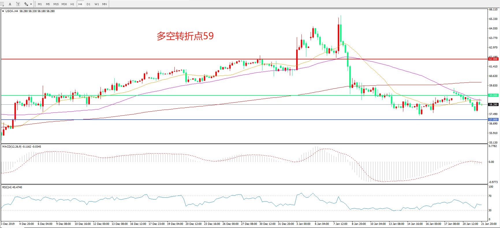 4小时图看,油价延续低位震荡走势,横盘仍然是近期走势的主基调,59美元是短期多空分水岭,如能顺利突破站稳,行情有望迎来反弹,均线系统走平,MACD绿柱减少,RSI指标向上,日内震荡上行概率较大。