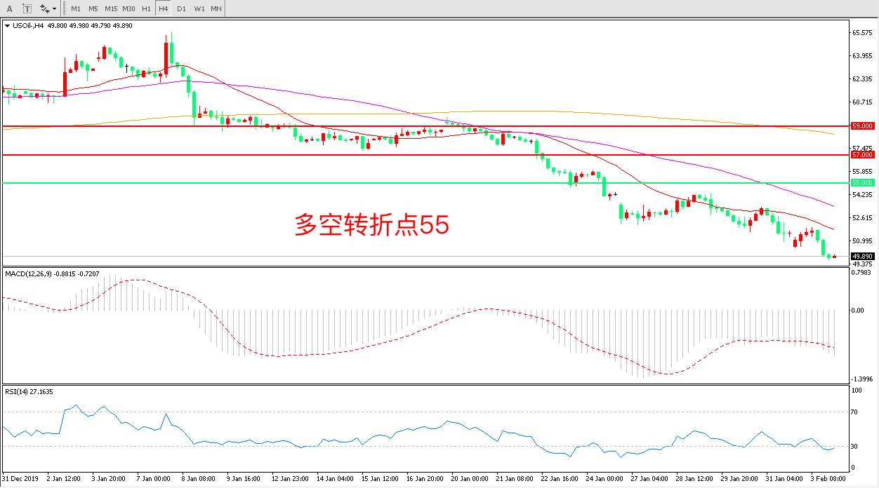 4小时图看,油价震荡走低,整体表现疲弱,均线系统呈空头排列,MACD绿柱增加,RSI指标向上走平,日内延续下行概率较大。