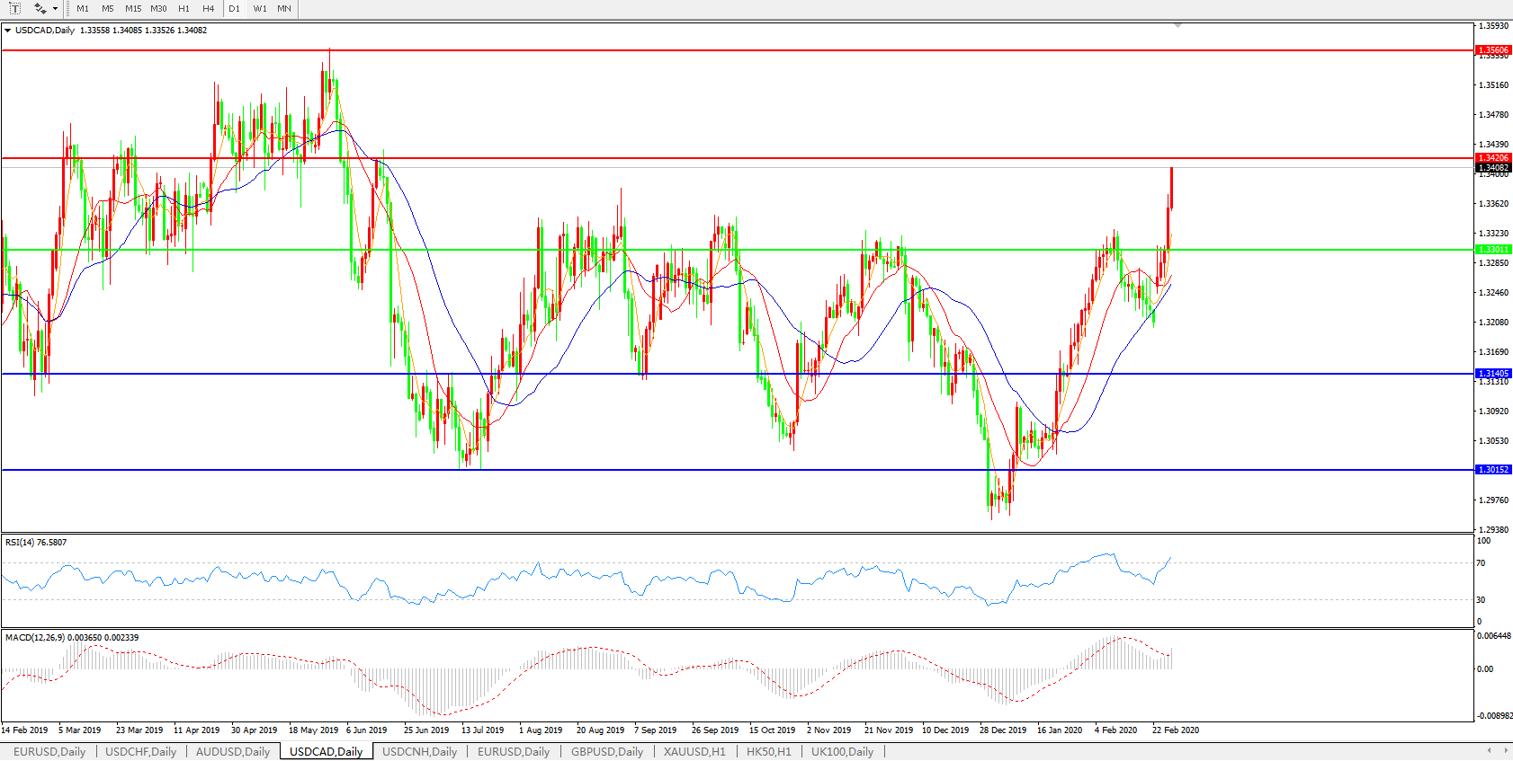加元汇价在周四延续此前颓势,美元兑加元在欧洲时段升至1.3359,创2019年9月3日以来近半年新高,原因在于国际原油价格继续暴跌至一年余新低,因而虽然美元本身走弱,兑更弱加元仍创出新高;全球范围内由公共卫生风险事件而引发的避险情绪在日内仍在继续发酵,市场更担心全球经济活动因为当前的生产与商务活动中断,而遭受难以挽回的影响,这在能源需求领域表现得最为显著。日内NYMEX原油跌破48美元之后仍继续跳水,与油价关联的加元因而也受到连带拖累; 而后,美国经济数据正受到密切关注,然而这可能带来双重影响,如果数据向好,美元走强将进一步推动美元兑加元走升,下一步将上看1.3383的前期高位,反正,则美元兑加元可能短线小跌,然而美加两国经济关联密切一损俱损,因此对风险情绪更敏感的加元在短暂反弹后,仍可能兑美元进一步承压。