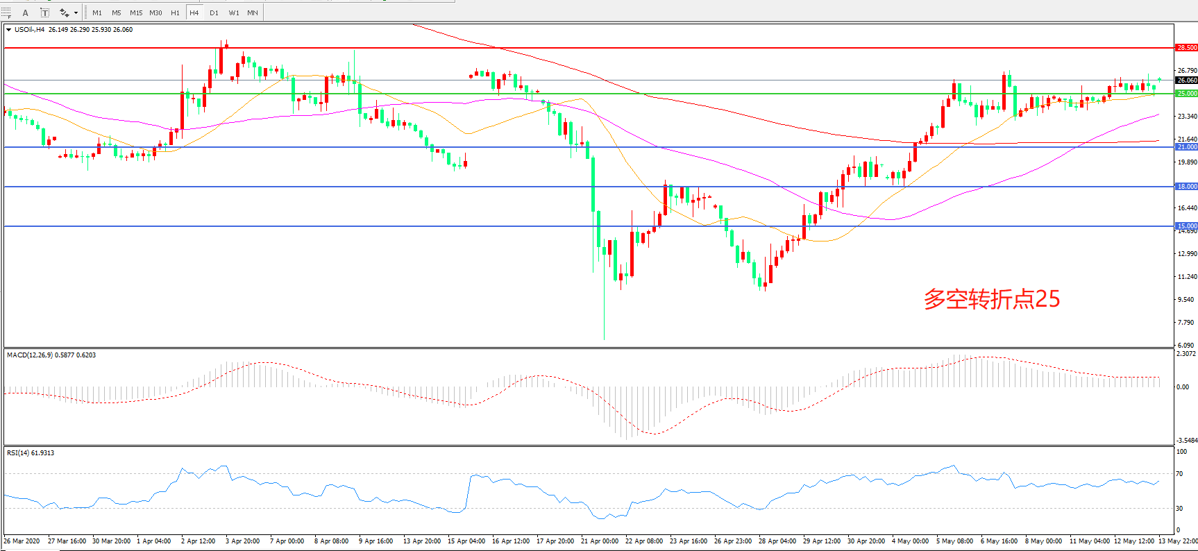 周三(5月13日),因美联储主席鲍威尔否决负利率政策,并警告经济需要数月时间才能从新冠疫情中复苏,引发了需求担忧,抵消了EIA库存降低带来的利好,美国WTI原油冲高回落,收报26.12美元/桶。
