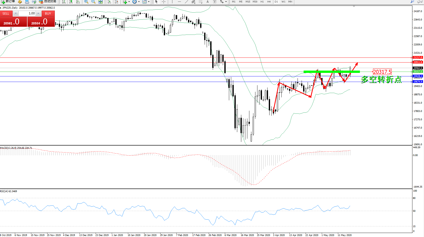 日经225指数518日(周一)收盘上涨89.53点,涨幅0.45%,报20127.00点。日本第一季度季调后实际国内生产总值(GDP)季率初值下降0.9%,预期下降1.1%,前值下降1.8%。日本政府表示,日本第一季度GDP标志着日本GDP连续第二个季度陷入收缩。日本低迷的经济增长前景可能在一定程度上限制日元上行空间。受疫苗研发乐观前景的报道,市场风险偏好回暖,美国股市飙升至3月初以来的最高水平,验性新冠疫苗研究的初步结果显示良好前景,提振了经济有望加快重启步伐的预期。