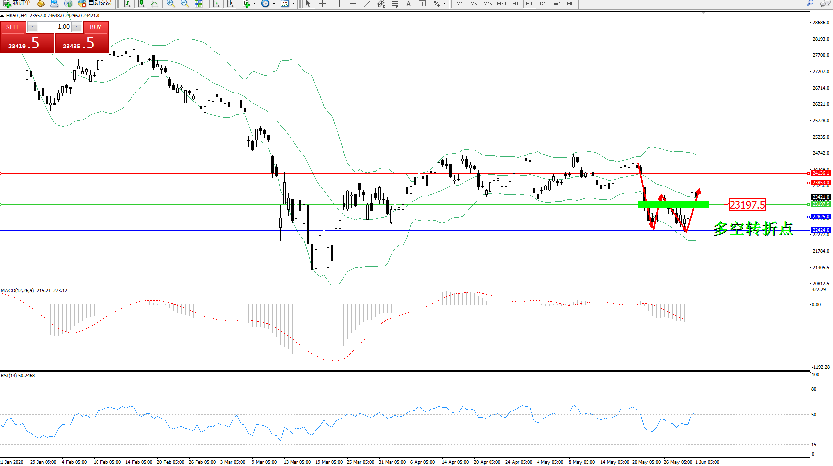 香港恒生指数61日(周一)收盘上涨771.05点,涨幅3.36%,报23732.52点;港股市场集体上涨,恒指大幅收涨3.36%23732点升近800点,创3月底以来最大涨幅。国指涨2.85%9833点。大市成交量为1507.53亿港元,南下资金净流入29.54亿港元。行业板块全线走高,阿里概念、半导体、生物医药领衔大涨,中芯国际飙升近8%;手机概念股、中资券商股、内房股集体爆发,恒指国指成份股4成以上涨超4%,腾讯大涨4.53%,港交所大涨4.66%;美团点评收涨近3%,续创历史新高。从数据来看,各项指标在逐步好转,复工复产在加速推进,内需和投资这块需要看政策力度。另外,国际贸易如果出现超预期对大盘会有刺激。
