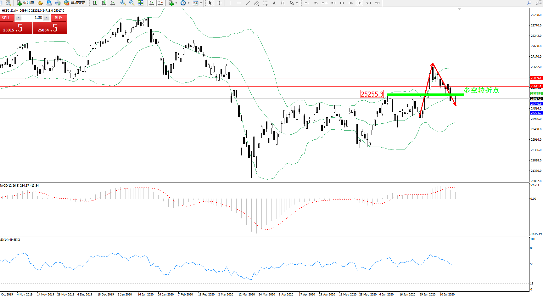 香港恒生指数7月20日(周一)收盘下跌31.18点,跌幅0.12%,报25057.99点;港股三大指数收盘涨跌不一,恒指弱势纠结于两万五千点附近持续徘徊,军工股再度活跃,中船防务飙涨超22%;中资券商股、汽车股呈普涨行情,比亚迪股份大涨12.2%,中金公司、国联证券均涨超8%;药品股、博彩股、收租股领跌,半导体板块亦走弱,中芯国际跌近3%。今日南下资金净流入59.87亿港元,大市成交额为1356亿港元。恒生指数将于2020年7月27日(星期一)推出恒生科技指数。新指数将会追踪经筛选后最大30间于香港上市的科技企业。恒生科技指数的选股范畴,主要涵盖与科技主题高度相关的香港上市公司,包括网络、金融科技、云端、电子商贸及数码业务。市值最大的30只股票将被纳入成为恒生科技指数成份股,其中包括阿里巴巴、美团点评、腾讯控股、小米集团。