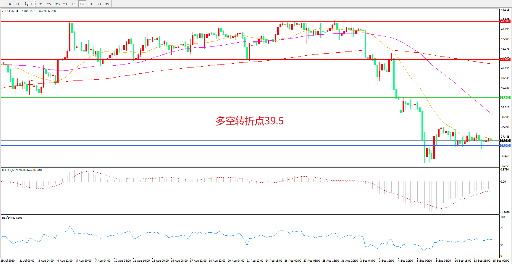 4小时图看,油价延续低位震荡,整体走势偏弱,21周期均线成为短期阻力,37美元成为短期支撑,MACD绿柱缩短,RSI指标走平,日内延续震荡概率较大。