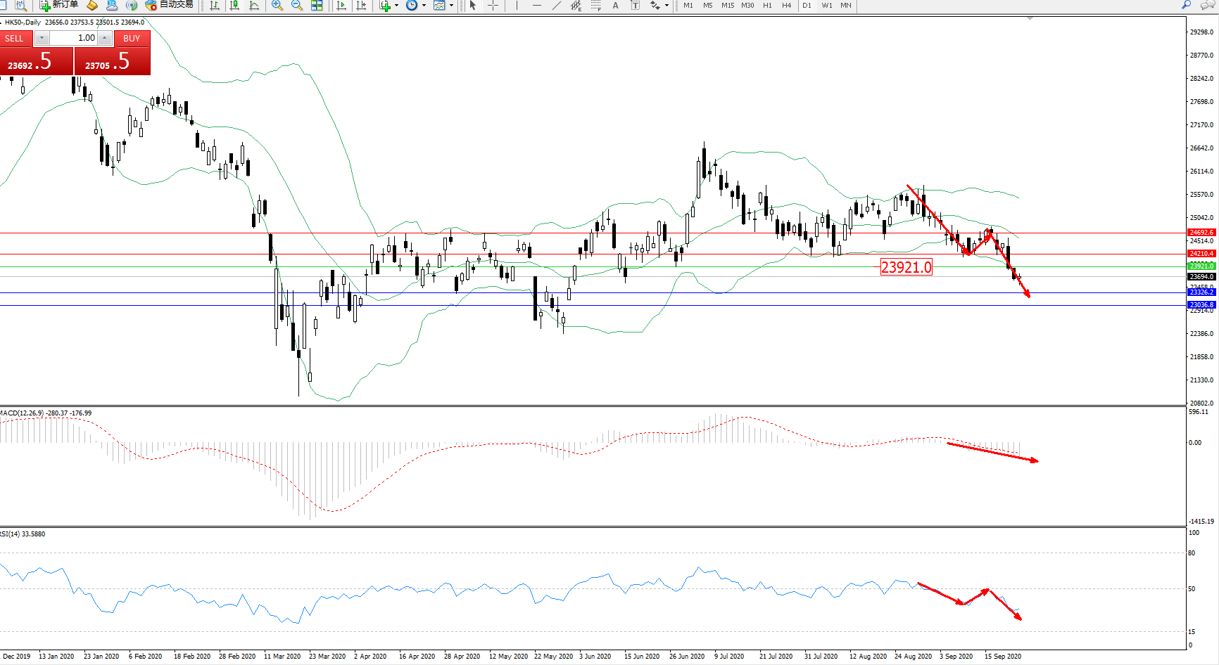 恒指HK50 ——日K线图显示: