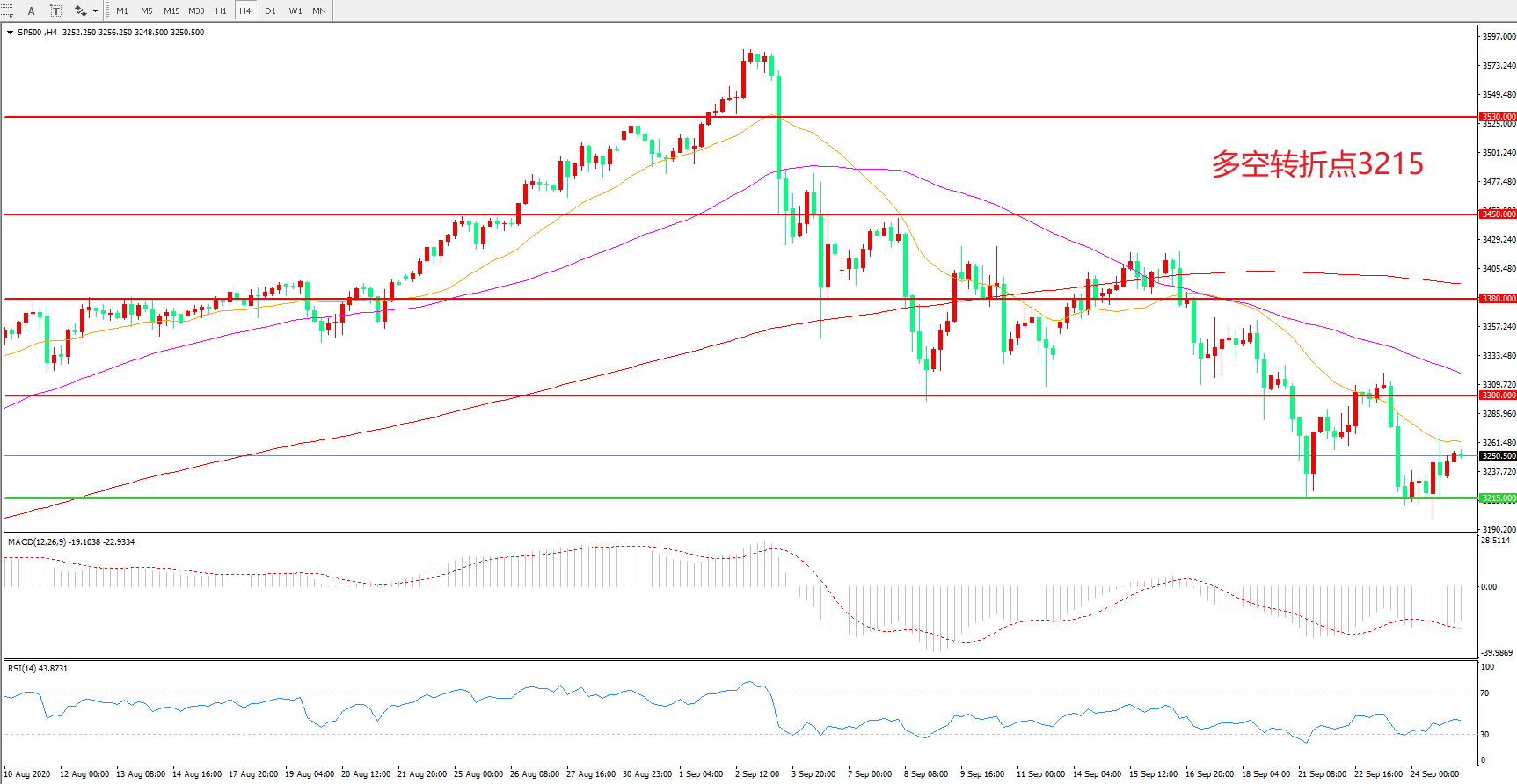 4小时图看,标普500长阴下破,短期跌势明显,3215成为多空分水岭,均线系统呈空头排列, MACD绿柱缩短,RSI指标走平,日内延续震荡概率较大。