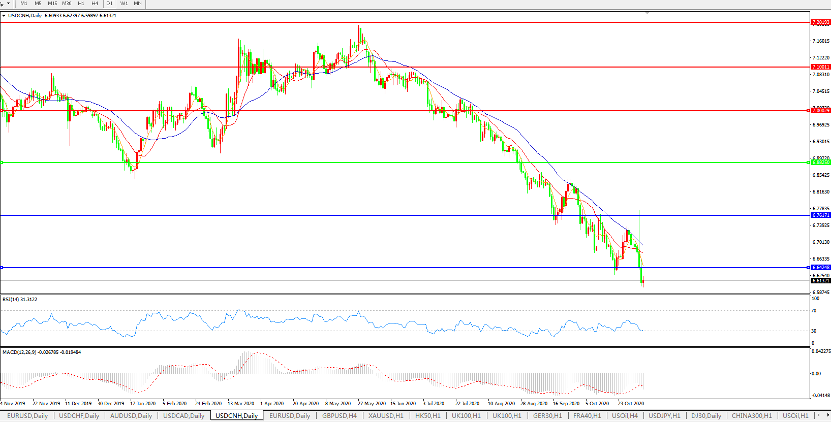 人民币兑美元即期周四收盘放量大涨738点报6.64元,创28个月新高,中间价则小跌,离岸盘中亦创28个月新高;交易员称,美国民主党候选人拜登几乎锁定胜局,全球风险偏好回升压低美元和美债收益率,人民币外汇和A股都获得资金青睐表现强劲;他们并表示,随着大选因素逐渐市场也将重新审视基本面,因为疫情仍在肆虐,无论谁当选总统都需要更大规模的刺激法案,美联储将保持支持性货币政策的立场,美元也会承压;瑞穗银行亚洲首席策略师张建泰称,当美国大选逐渐尘埃落定,市场注意力将迅速回到基本面;市场预计美国新一轮财政刺激谈判仍将陷入僵局,美联储可能面临更大的扩大量化宽松以支持增长的压力;美国民主党总统候选人拜登周三表示,他正朝着在大选中击败现任总统特朗普前进,此前拜登声称赢得了关键的中西部威斯康辛州和密西根州;而特朗普则通过提起诉讼和要求重新计票对计票工作发起了多面攻击。