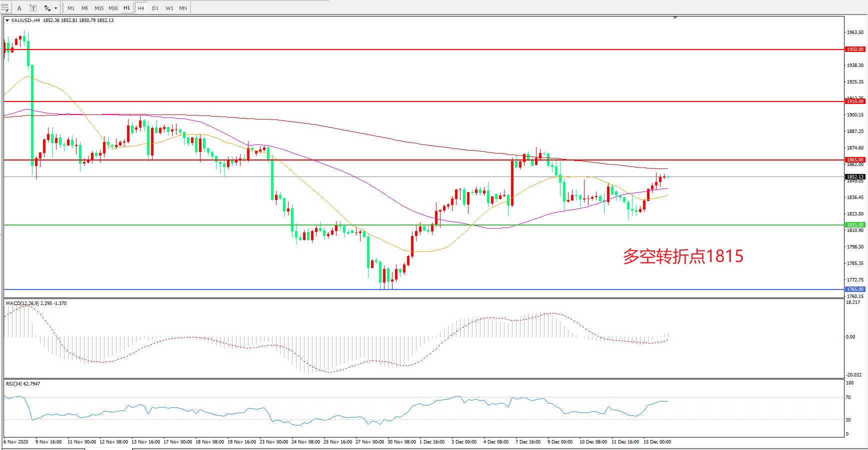 周二(12月15日),众议院议长佩洛西邀请其他三名两党国会领袖周三开会,试图就政府支出方案和出台新一轮抗疫救助刺激达成协议,,这将是四人迄今为推出两党一致同意方案所作出的最重大努力。市场对财政刺激预期升温,金价自低位大幅拉升逾20美元,收报1852.20美元/盎司。