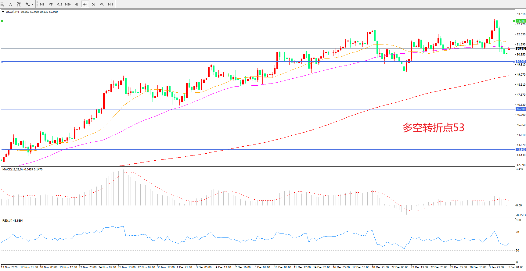 交易策略: 在53.00之下看跌,目标50.00 46.50