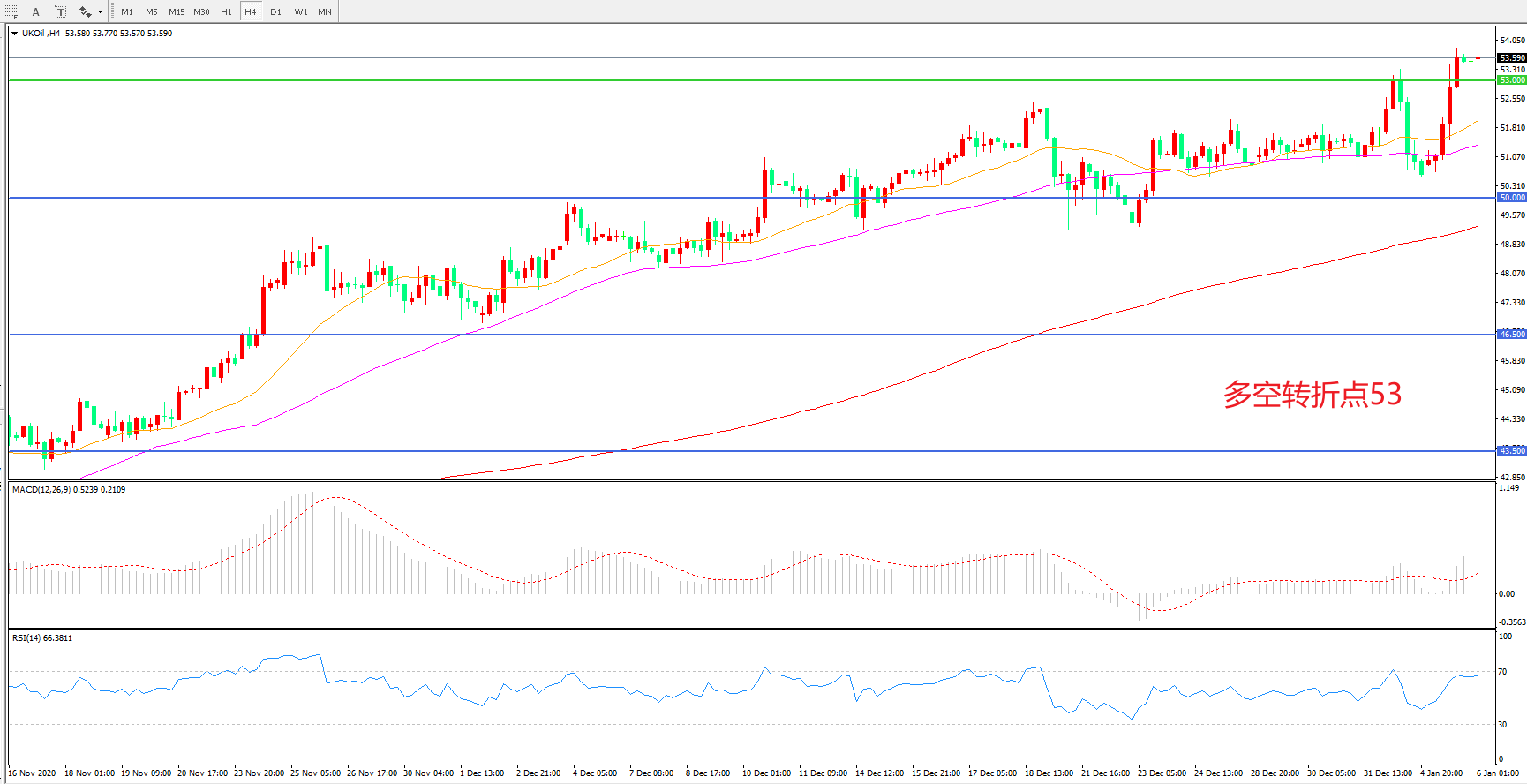 4小时图看,油价长阳拉升,前期跌幅被全部收复,短期走势偏强,53成为短期多空分水岭,均线系统走平,MACD红柱增加,RSI指标走平,日内震荡上行概率较大。